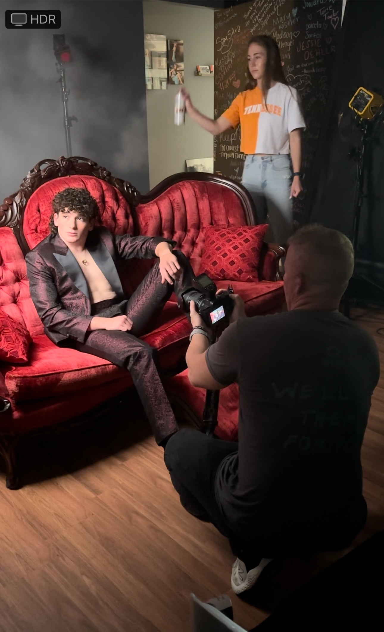 I had the senior sitting on my. antique couch. I used an AD 300 in a soft box camera left positioned directly to the subjects side. I had an AD200 with a red gel bare bulb for the kicker. I used aerosol smoke behind him for atmosphere. I Shot super close up with a wide angle lens at 24 MM