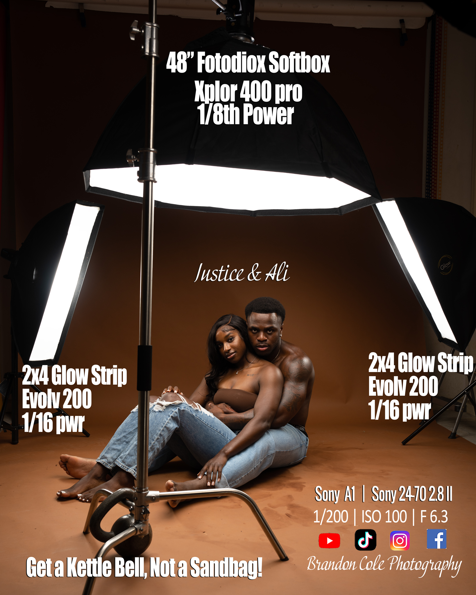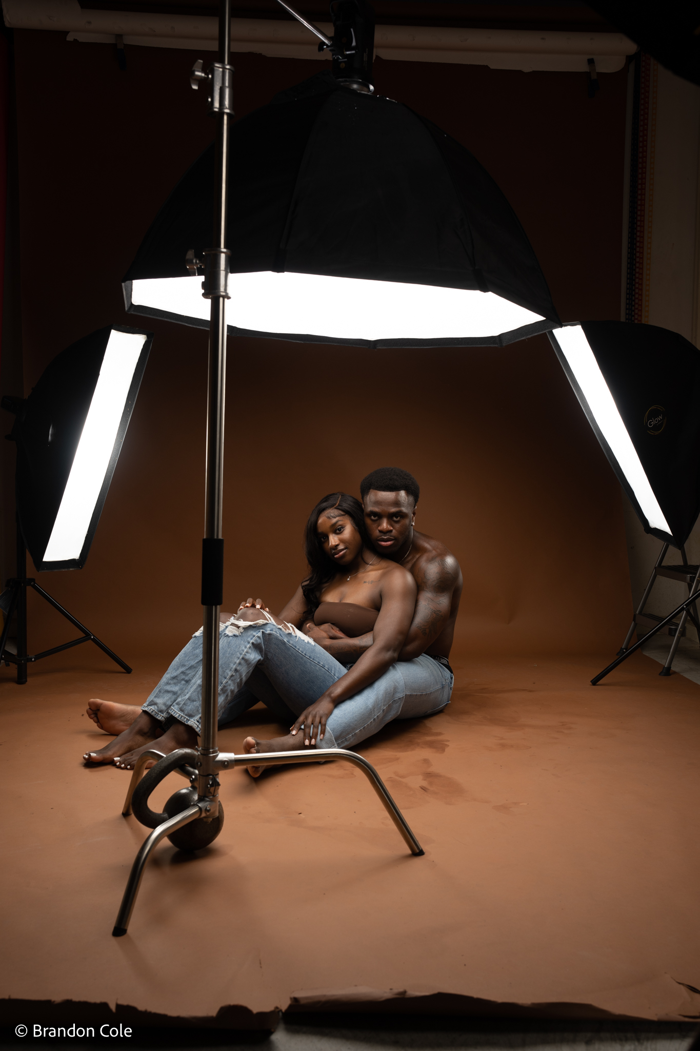 Justice and Ali for a couples photoshoot. This was a 4 light setup. Two. 2×4 ft soft boxes Evolv 200 to the rear on left and right of models. 7ft over head umbrella with Xplor 600 pro. Brown Savage backdrop.
