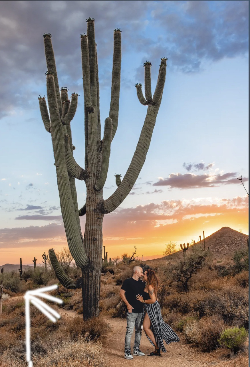 Couple in the Scottsdale desert at sunset. In love. Used a soft box with an AD 300 to light them and removed in post.