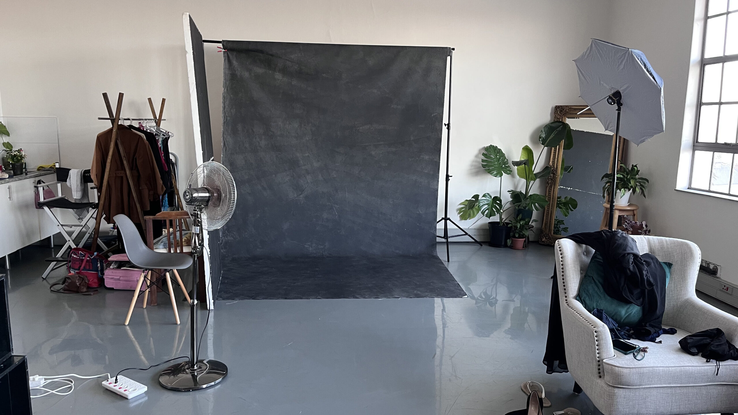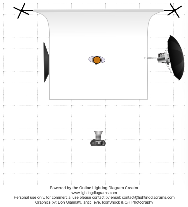 I used a textured black/blue backdrop that I made with a black poly board on camera left, as well as a fan on camera left to blow her hair and the fabric. My make up artist threw the fabric to get it falling as you see it in the picture.