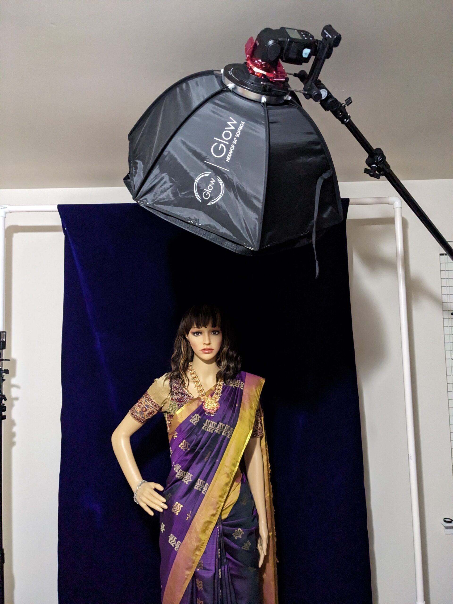 Triple exposure shot achieved with one light. Light source was a flash with gels. Used a soft box with grid. Underexposed for a moody effect. Behind the scenes picture shows a background, but this picture was shot with just the wall as background.