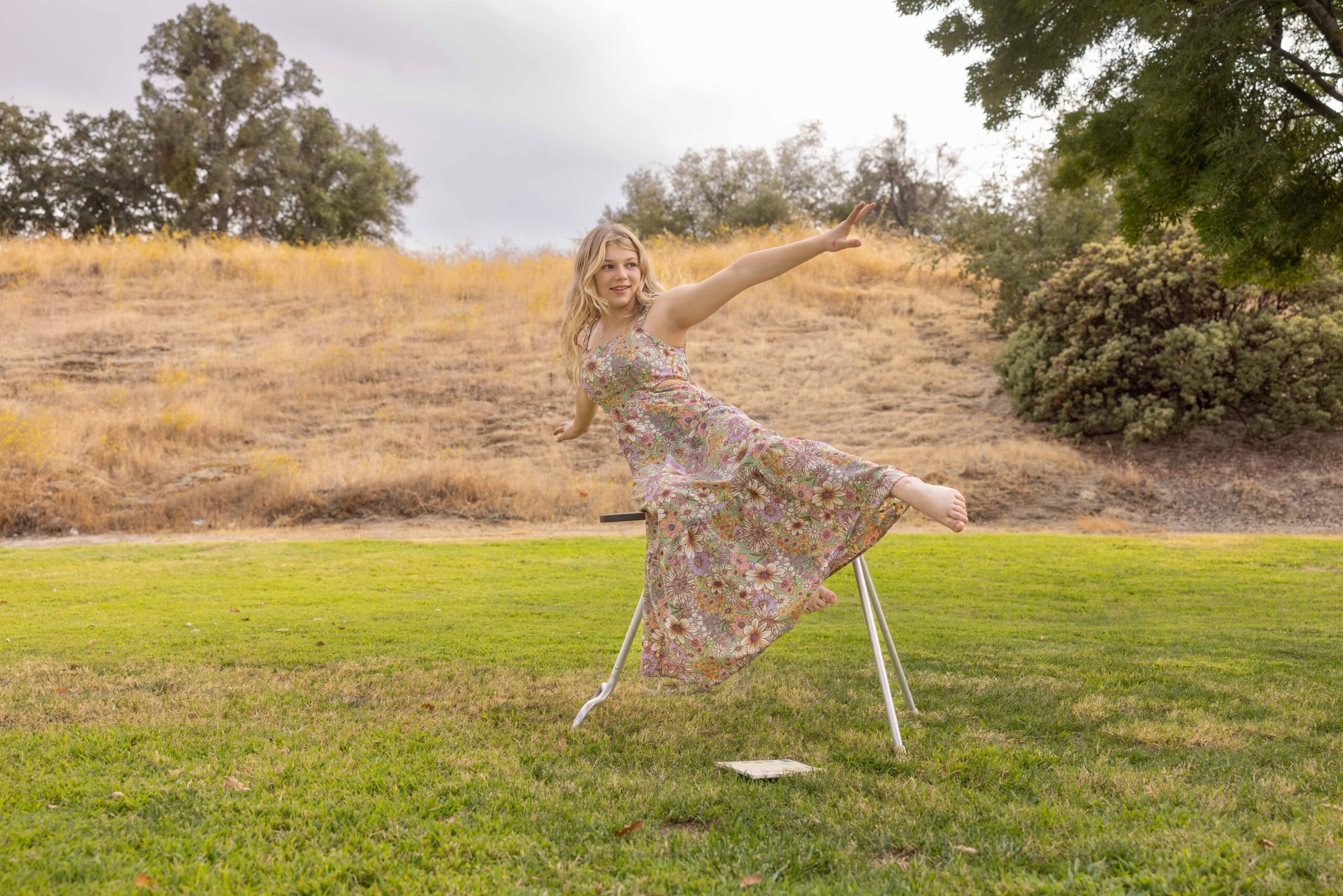 This image was created outdoors on a cloudy afternoon as the sun was fairly low on the horizon to camera right. A reflector was used on the left for fill light. She loved the flowy material of the dress so I decided the best way to show that off was levitation (It was also a way to get some genuine smiles).