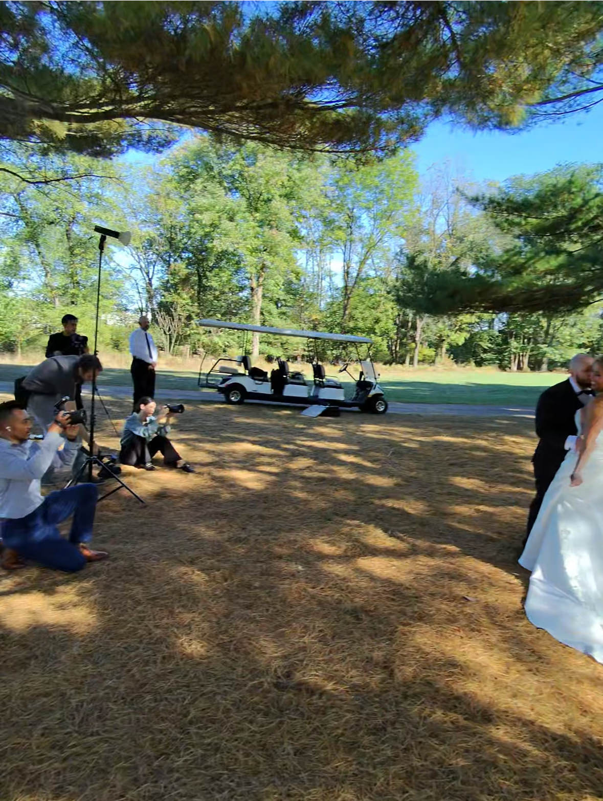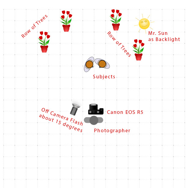 I loved the row of trees that created leading lines for the the scene. I also spotted the Sun at a perfect angle to create the backlight for the couple. So all that’s needed was a front light. I used an AD200 off camera flash with a Magmod Sphere to illuminate the subject. We posed them in a romantic way with a happy expression and added the element of the veil motion. We got the perfect veil shape in one try!