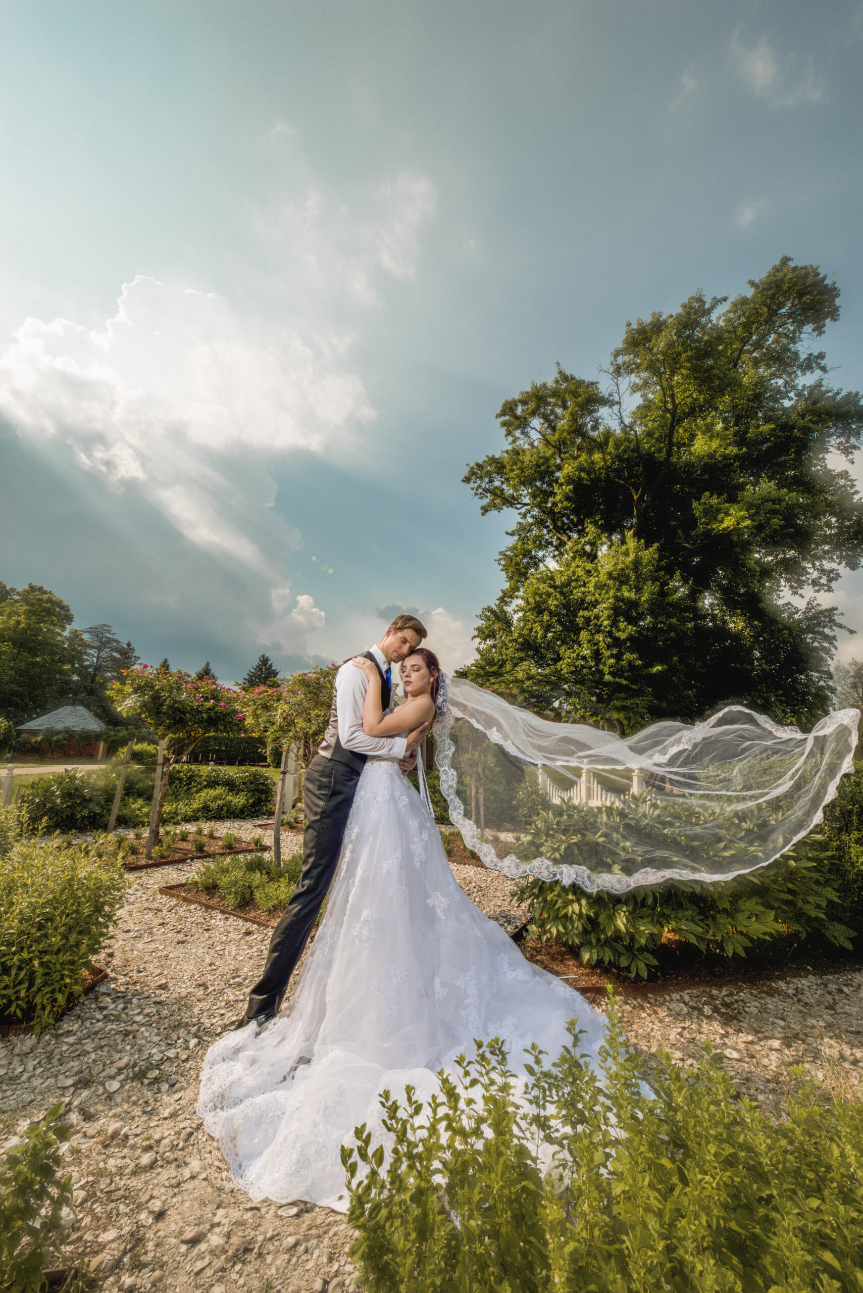 One light setup camera left and the sun peaked out behind the couple camera left. Due to the hot spot, the sky was replaced in post to give more dramatic effect and focus on the couple.