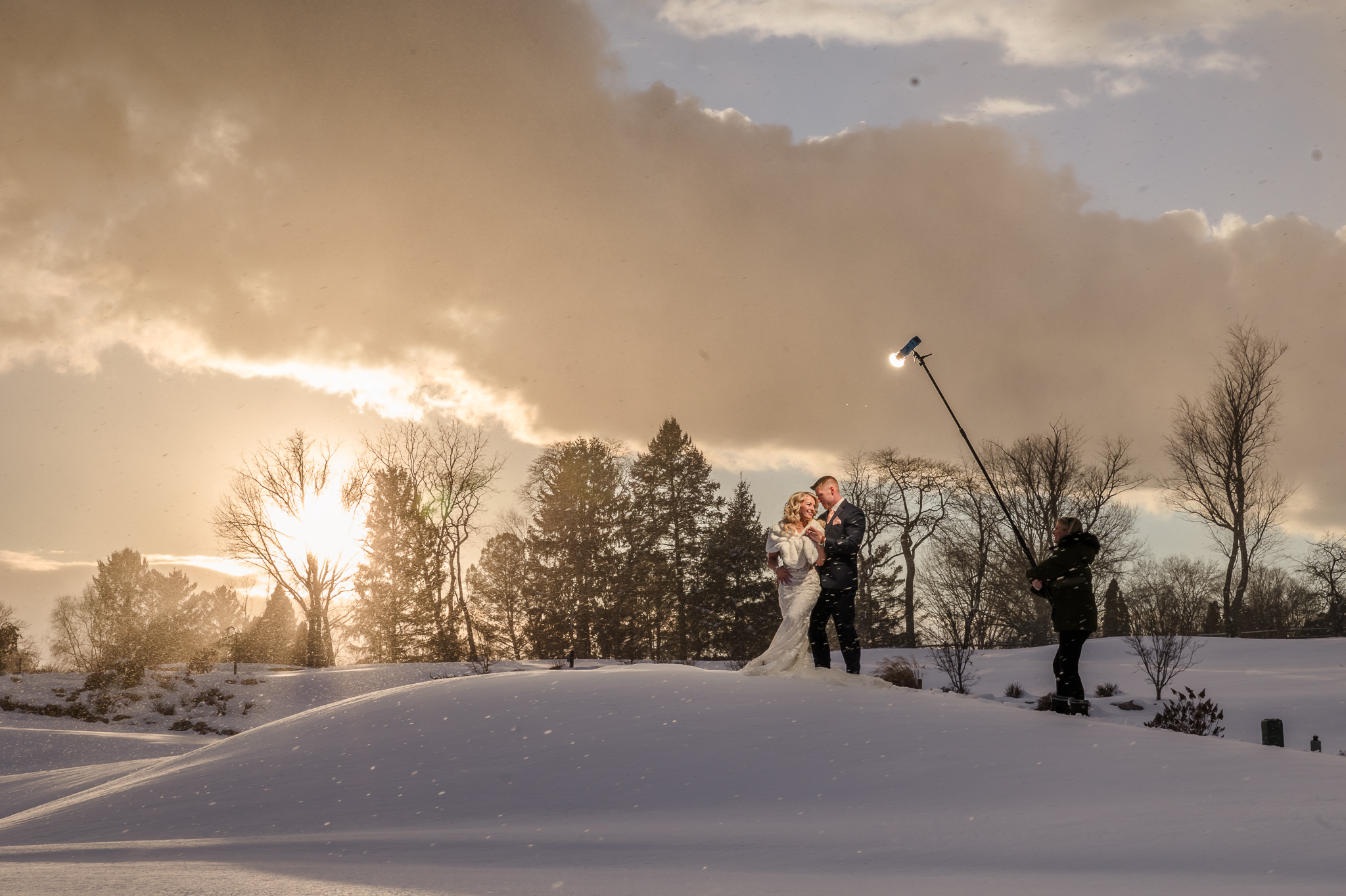 This image was shot during a snow squall at 5:38 PM EST in February. The sun was setting behind the couple and the only source lighting the front of them was an FlashPoint eVOLV 200 with a MagMod Sphere hand-held on a lightstand camera right at about a 45° angle. The light was probably at full power.