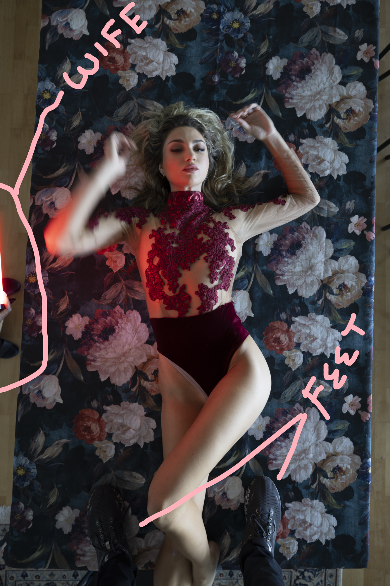 So for this shot we were in a Villa in Cape Town and about ot leave for the location we were planning to shoot at that day. Tyler was one of our models from the area and i had targeted this table in the living room with a floral table spread. so i asked ger to lay across the table and give me some angles, triangles with her arms and curves with her legs. I got up on the table and stood directly over her with a 15-35 rf lens. My wife was assisting by hand holding a nanelight 10″ pavo tube set to red hue at 50% camera left. The light on the right was gods light coming from the balcony glass doors about 30 -40 feet away. Took about 20 frames before we jumped into Van to head to location.