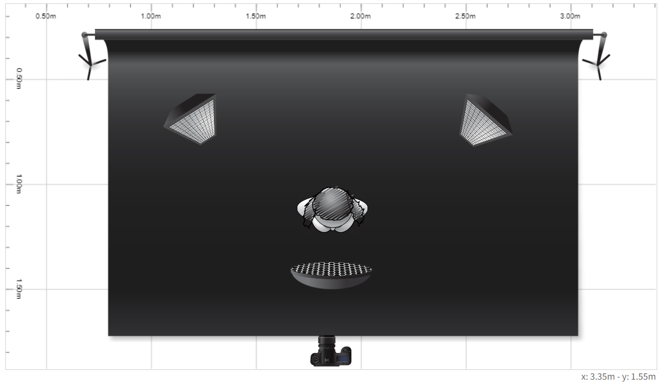 This image was done for a special FX makeup company. The model was draped in red fabric on a hand painted molded brown and cream canvas. There is a gridded beauty dish on a 400 watt studio strobe (full power) on a boom high above her head and tilted about 70 degrees towards the background. Behind the model are 2 – 200 watt studio strobes (full power) with 1×3 gridded strip boxes facing towards her back. There is actually very little post in this image beyond the straightening of fabric at the foot and of course the symbol in the back.