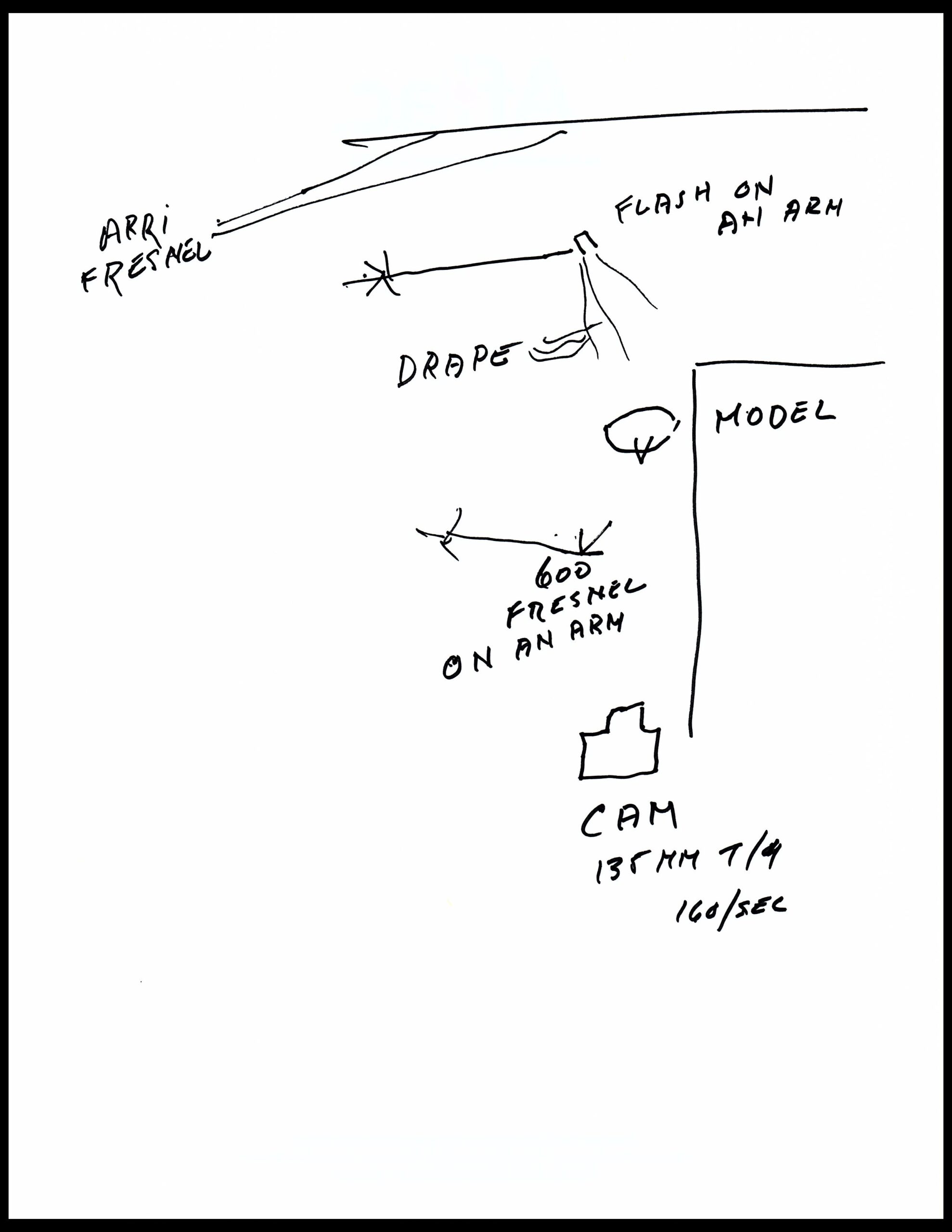 Key light was a constant Arri 600W fresnel, above and between her and the camera with no diffusion. A Flashpoint manual setting (non-TTL) was set as the hairlght and also caught the drape behind her. A 300w constant fresnel scraped the wall in BG to create a low cut.