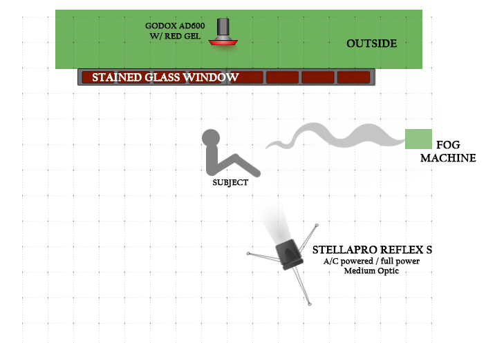 Model: Emily Ropes Shot with a Stellapro Reflex S (with wide optic) as our key light, and a Godox AD600 with a red gel outside the window, shooting back in behind the subject. I shot fog in between the window and the subject to give the red light a lot of dimension.