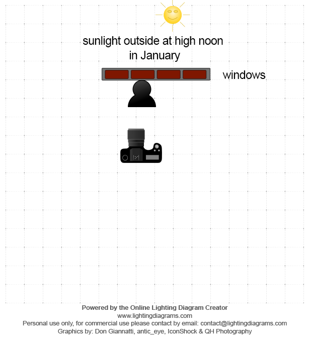 Taken in the winter month of January indoors with natural light. The sun was shining bright around high noon time. Came through the windows and reflected off the ground onto her face. Camera spot metered on her face.