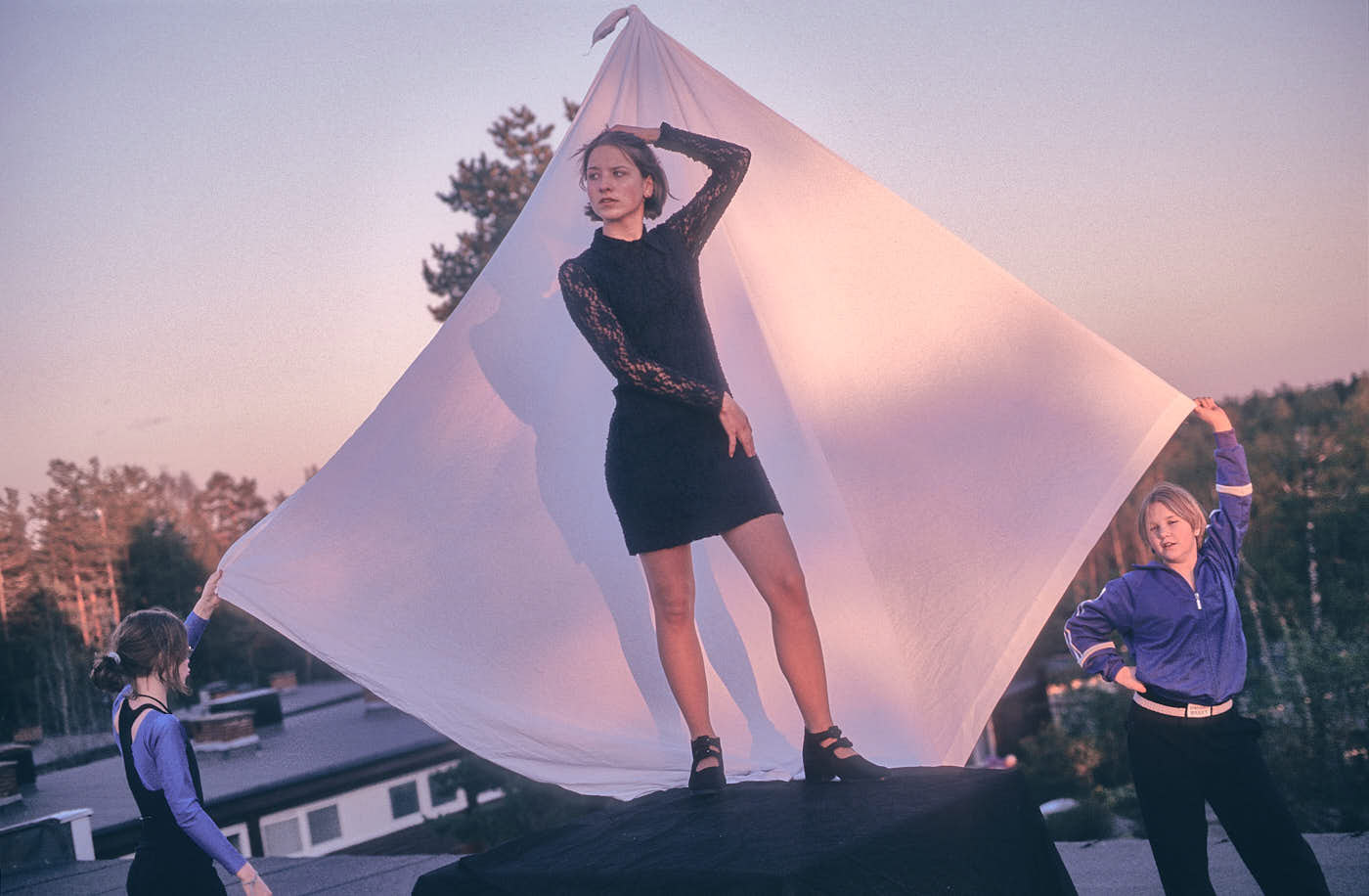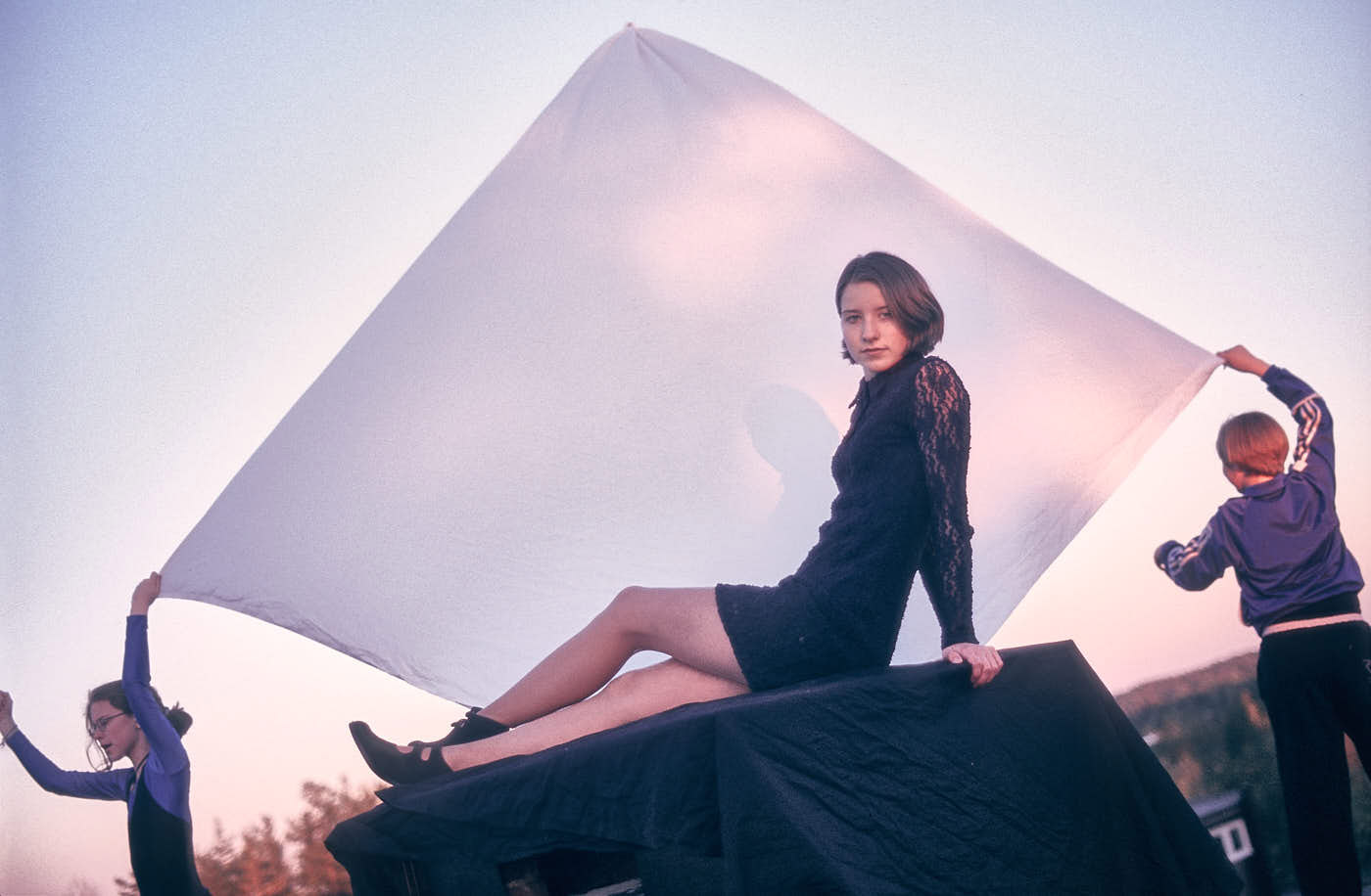 Being that this is a natural light portrait, no special gear was used, just a white bed sheet for a background. For me the aesthetic appeal is the pine tree-created dappled sunlight, combined with the soft yet directional evening sky “light bank”, which together create a palette of light blues and oranges. This contrasts nicely to the monotone, dark clothing and facial features, with the pose and gaze adding a little extra visual allure.