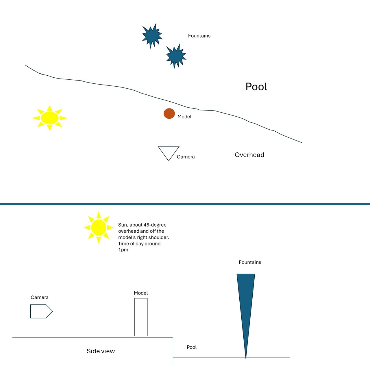 We wanted to obtain a 1950’s Hollywood starlit fashion-glamour look. We used the movie “Breakfest at Tiffany’s” starring Audrey Hepburn as the basis. Lucy Tobey was successful in recreating the look of Audrey Hepburn. For this specific photograph. I positioned Lucy in the edge of the pool with the water fountains behind her. I ensured to position us to place the sun off her shoulder and slightly in front of her. Due to the time of the day. The sun would be about a 45-degree off her right shoulder and forward of her.