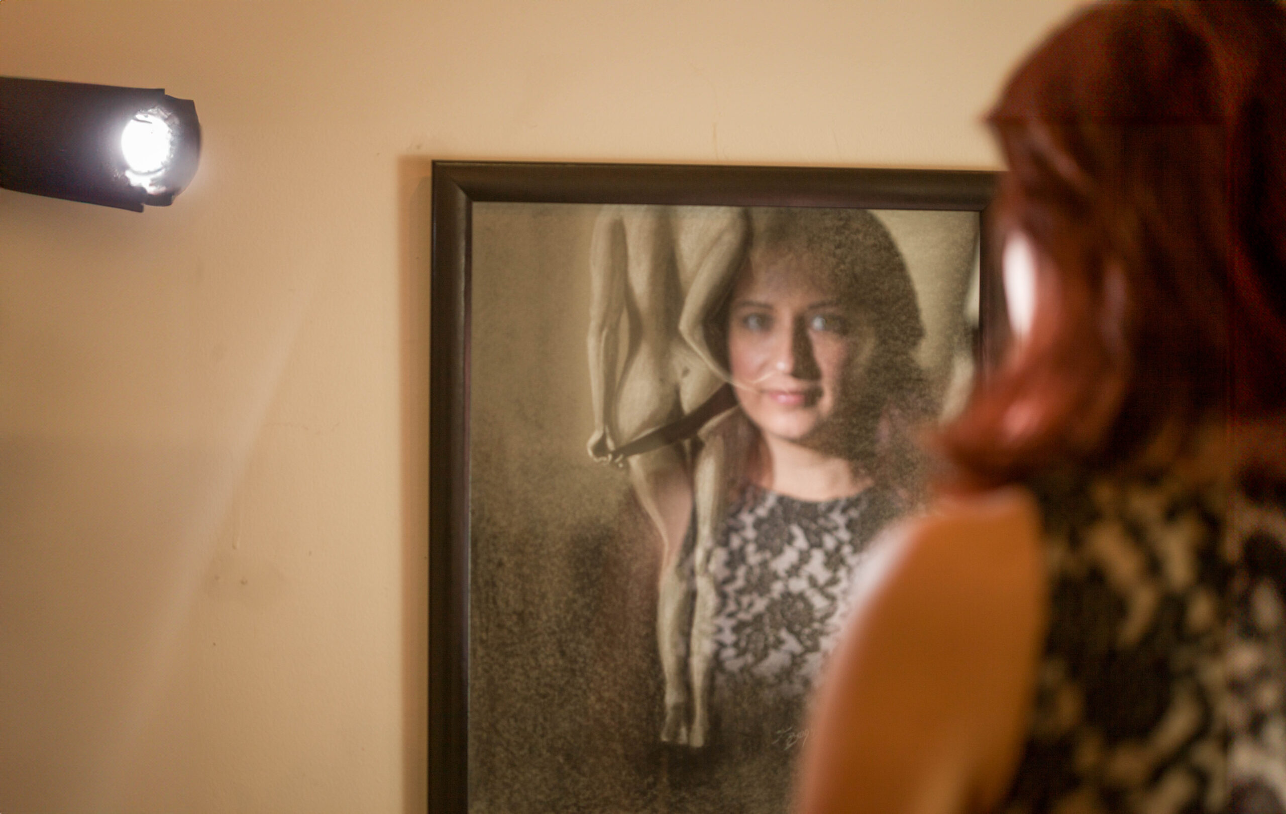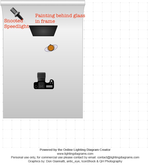 A portrait of my good friend Fryda with her painting, done during the actual art show. One snooted speedlight to light her Fryda’s face. The house lights lit the painting that was hanging on the wall. I had Fryda facing her painting so I could use the reflection of her pretty face.