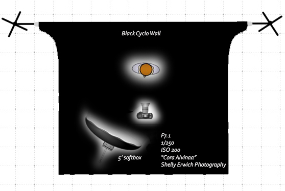 Shot at Royal Flash Studio, Tukwila Washington Black Cyclorama background 5′ Softbox single light set up Check her eyes, you can see me and the light placement. Shot with a Nikon d810, and a Nikon 60mm Macro lens