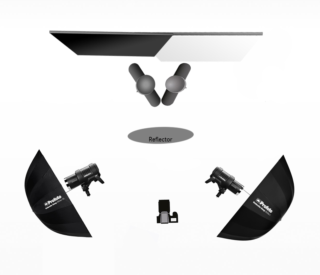Yin & Yang Sisters For this image, I set up a half white / half black backdrop. I used 2 Profoto D2 monolights with silver umbrella modifiers to evenly light the girls faces. A white reflector was used to bounce light from below.