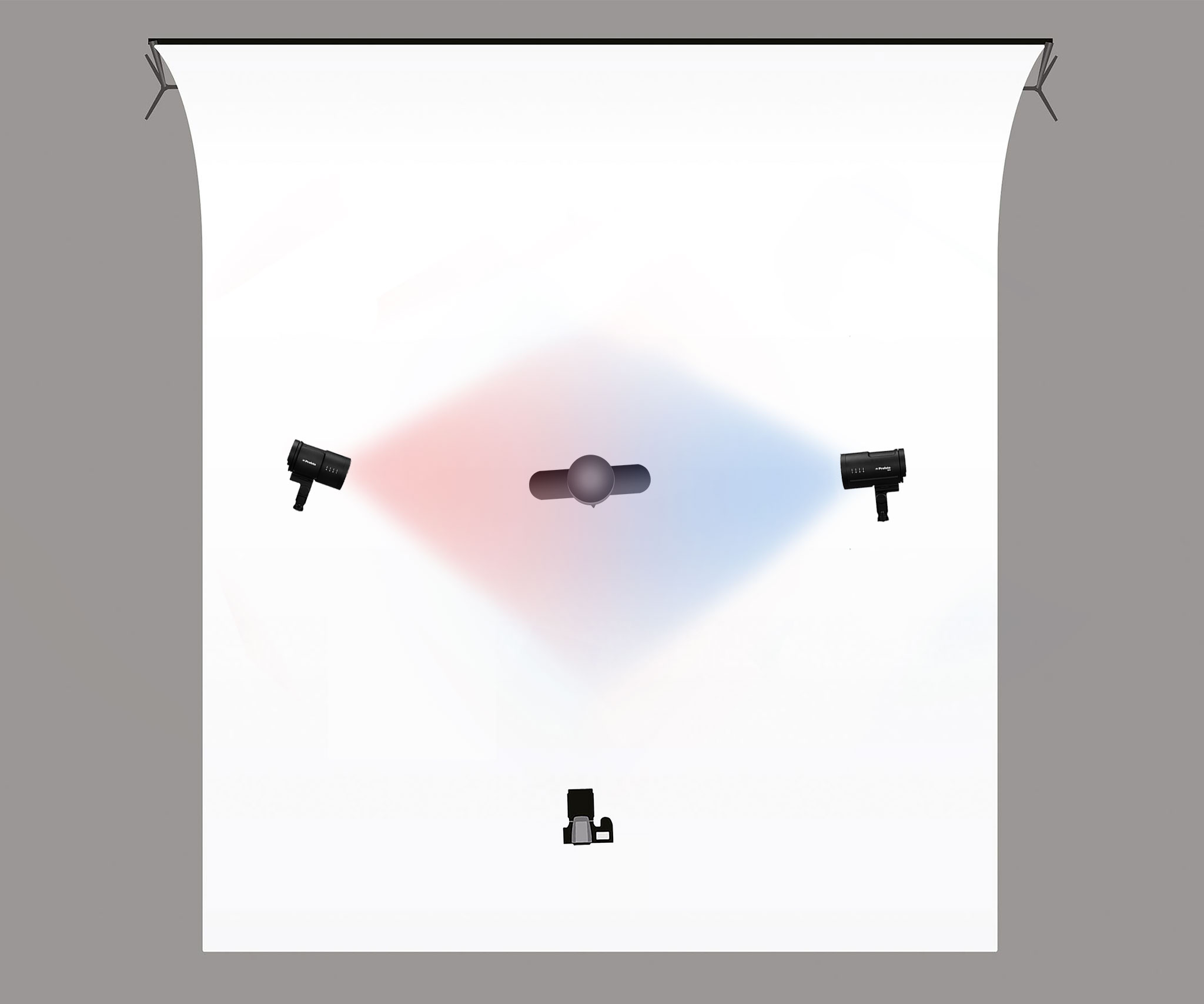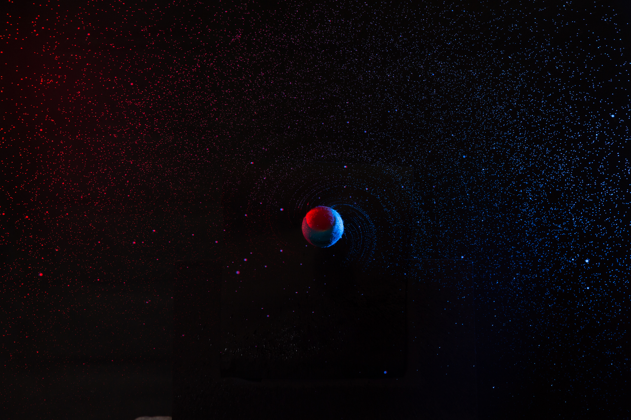 Show with two Godox AD200’s with Gels placed at 3 O’Clock and 9 O’Clock. The tennis ball was placed on a drill to have it spin in place and the water to spray out to look like planets in the universe. Fernando, the Spanish Greyhound, was shot seperate from the tennis ball and had him catching treats. Both images were compositied together