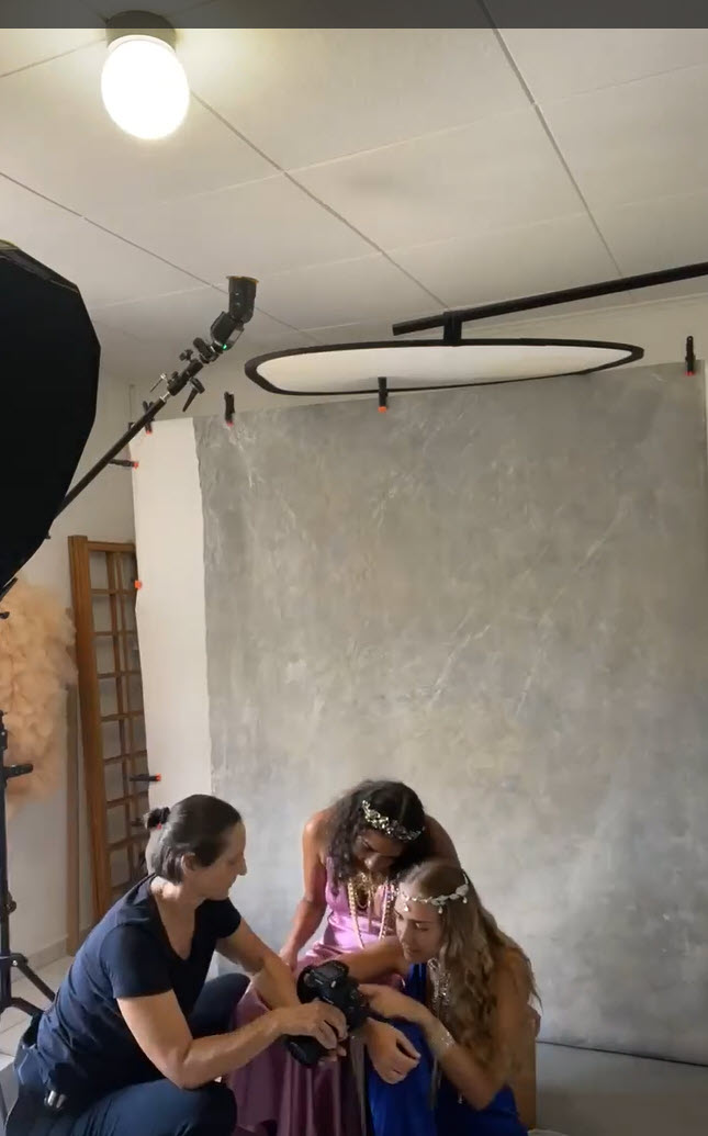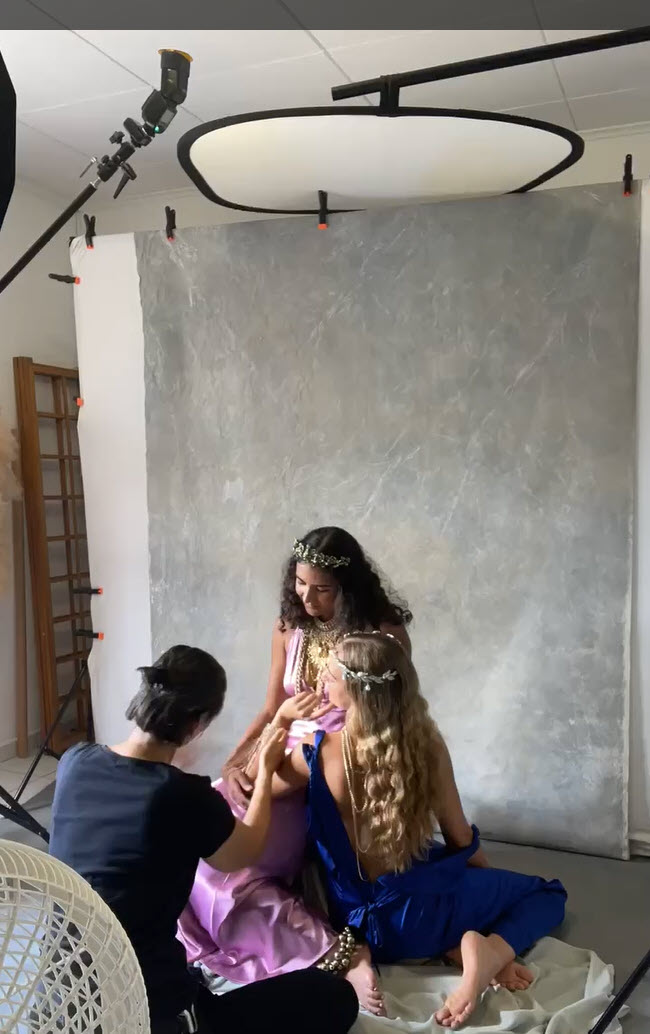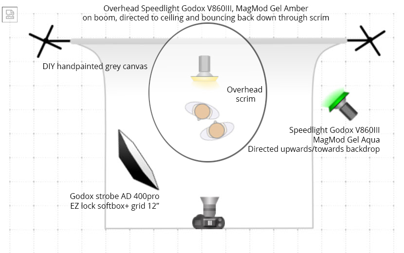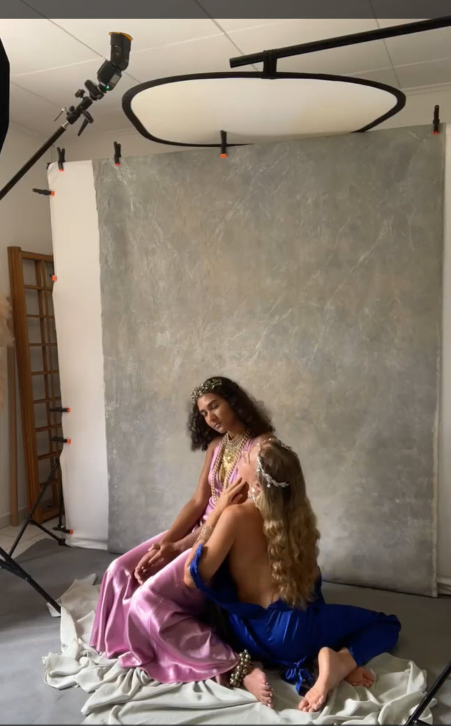 The intend for this goddess like fine art portrait was to create richness in colors with an etherical glow using MagMod gels in a very careful and subtle manner. While a warm orange (pro artistic gel- amber) is directed to the ceiling, bouncing back from overhead in order to enhance their silk like skin, a cooler cyan (pro artistic gel- aqua) is giving color to a grey hand painted canvas. A big octa acts as a lower dialed in base layer to bring up shadows and to define. The attempt to radiate a lavish vibe is reflected by using ample jewelry and heavy, flowy, softly draped satin wardrobe. The close crop is deliberately chosen to create a sensation of partaking in the moment, being so close that one imagines hearing their breathing and being emerged in their energy. The affectionate posing reflects profound trust and connectedness to each other and to one self. The portrait reveals their individuality being as different as day and night in their appearance and temper; however, the lighting and posing ties everything visually together, representing they are deeply entwined, – being sisters.