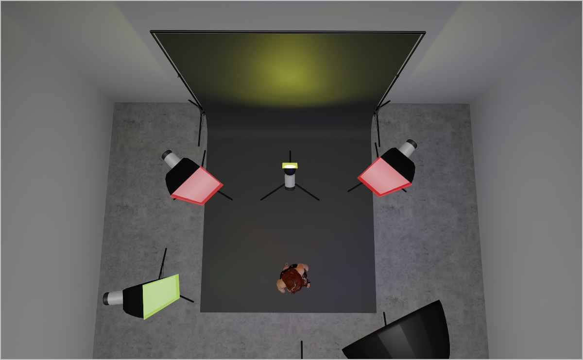 For this image, I positioned Miranda against white seamless paper. I used one strobe with a yellow gel and grid behind Miranda pointing toward the backdrop. This created a yellow gradient. I placed two strobes, with barndoors and red gels for rim lights (my lighting setup software does not have barndoors, so I used strip boxes — but I usually use strip boxes for rim lights anyway). Keylight was a softbox with blue gel. Then for fun, i added a fifth strobe with a green gel. I know — green never looks good on skin. But I was being a rebel.