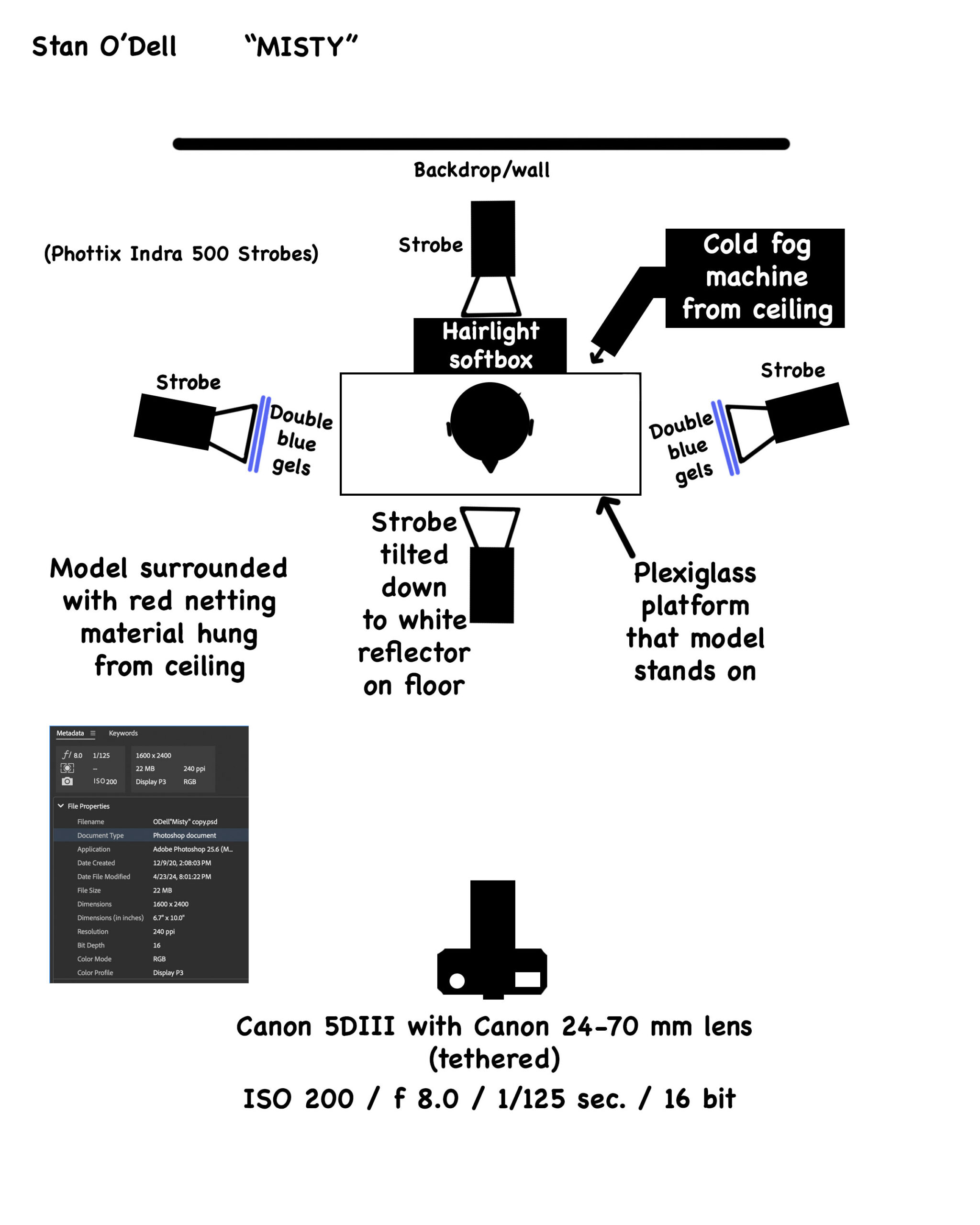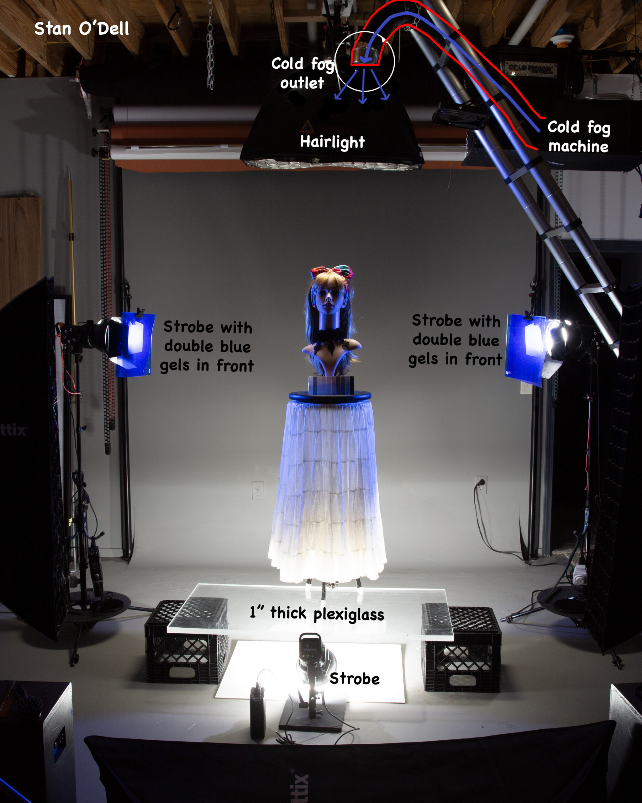 As can be seen in the Behind the Scene photo, this shot took four strobes, four blue gels, one hairlight softbox, a heavy-duty plexiglass sheet, a cold fog machine, a large tent-like red netting, and a very cooperative model. The model, standing on plexiglass, is lit from the sides with strobes that have double blue gels in front, an up light strobe from the floor, and an overhead strobe down light. A cold fog machine adds atmosphere that is saturated with the blue light from the gels. Red netting surrounds the model that adds a somewhat mysterious semi-transparent effect.
