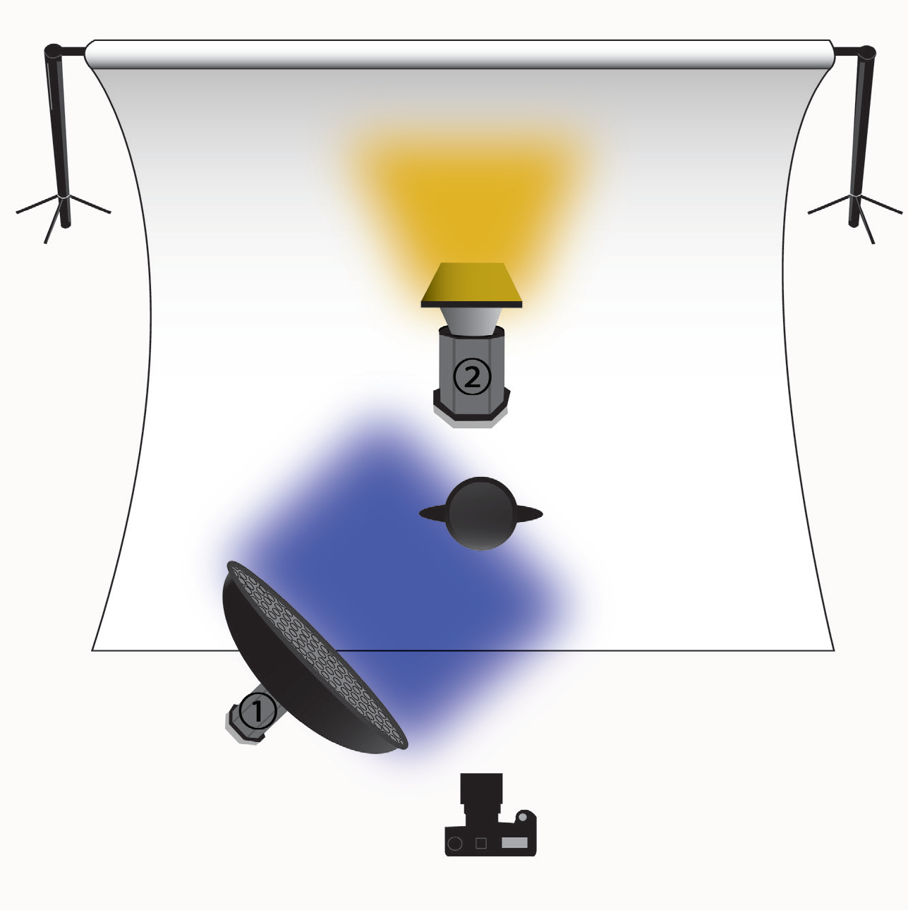 High contrast blue and yellow portrait of Violet. Strobe with zoom reflector and Yellow gel pointed at white seamless backdrop. Beauty dish with grid and Blue gel as key.