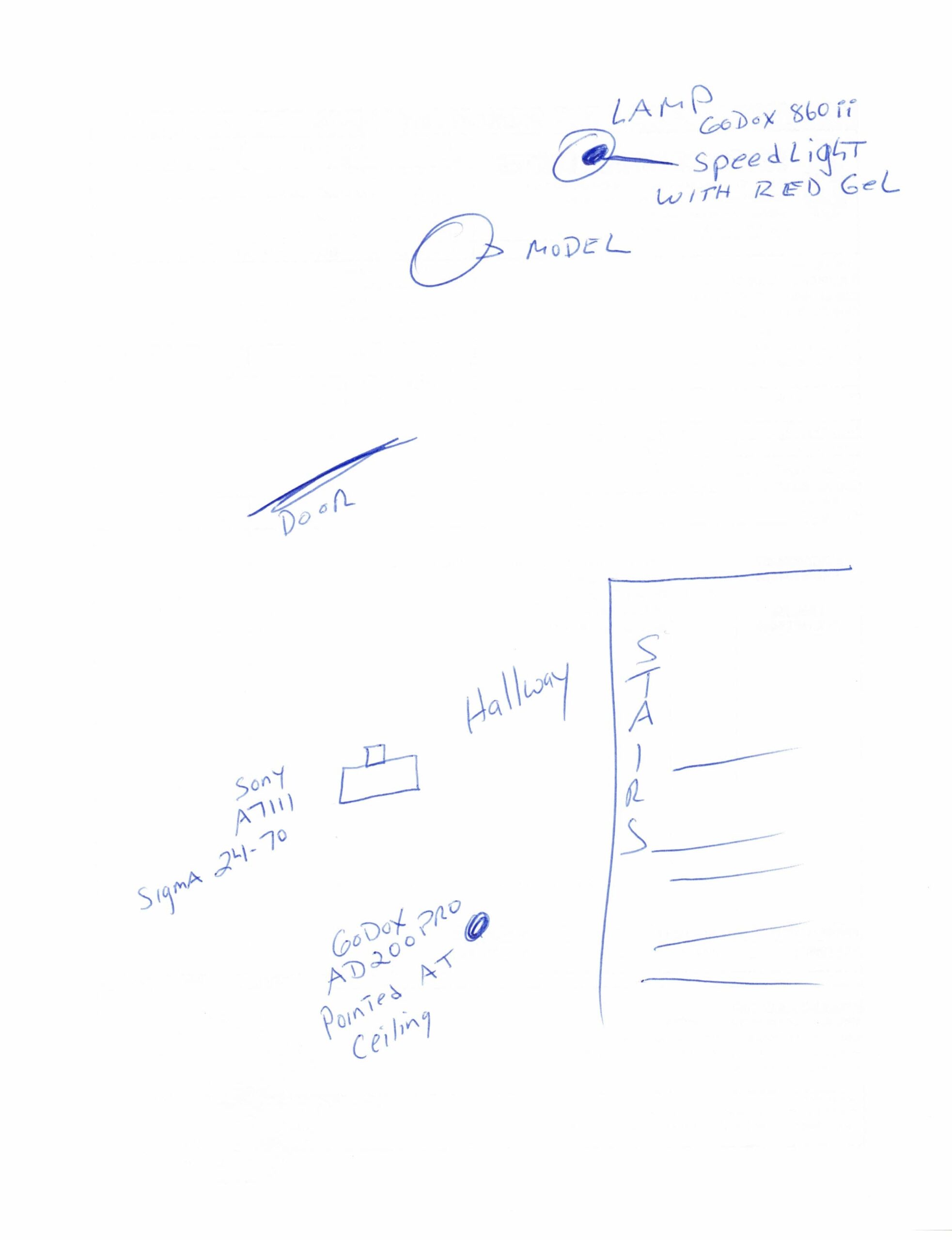 I placed a Godox 860ii with a red gel in the lamp lighting the background and silhouetting the subject.. An AD200pro was placed behind and to the right of camera, pointing to the ceiling to light the door, hand and sign.
