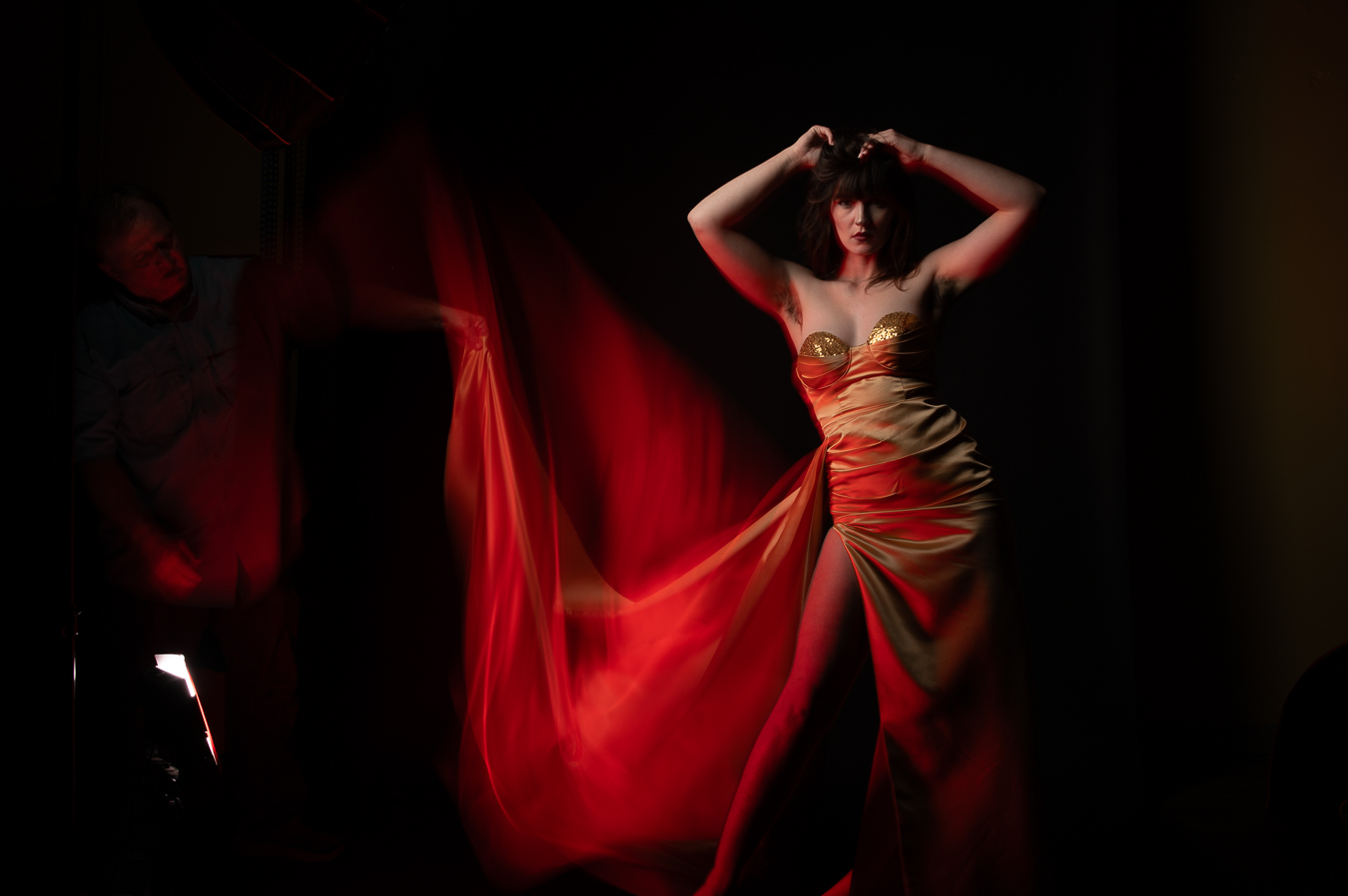This image was created using two lighting sources against a black paper backdrop. I used a strobe equipped with an octabox and a grid, positioned high and to the left of the camera, to achieve a Rembrandt lighting effect. Additionally, I placed a constant light panel with an orange gel below the main light, directed at the dress, to capture the motion blur as the dress moved. I set the shutter speed to 1/5s. Since I don’t have an assistant, I mounted my camera on a tripod and used a shutter timer. You can see me in the behind-the-scenes photo, actively waving the dress. It’s one of my favorite shots from 2023.