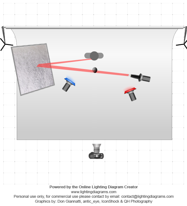 The crystal, mounted on a light stand, is lit with a slide projector (camera right) fitted with a 180mm telephoto lens, and a slide containing red and white patches. Some of the light beam passed beside the crystal, and with a mirror on camera left, this beam was reflected onto the model’s face, around the left eye. The face is lit fairly flat (i.e. without deep shadows) with a blue-gelled strobe and purple-gelled strobe.