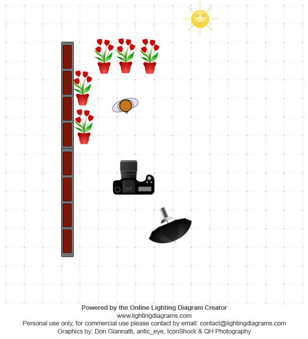 I had the subject next to a house that had ivy growing along the wall. Artificial and natural plants were used in the foreground and background to add to the ivy along the wall. I used a light meter to get an ambient light reading and set up a speedlight bouncing into a silver umbrella behind and to the right of the camera. Photo was taken in the early afternoon.