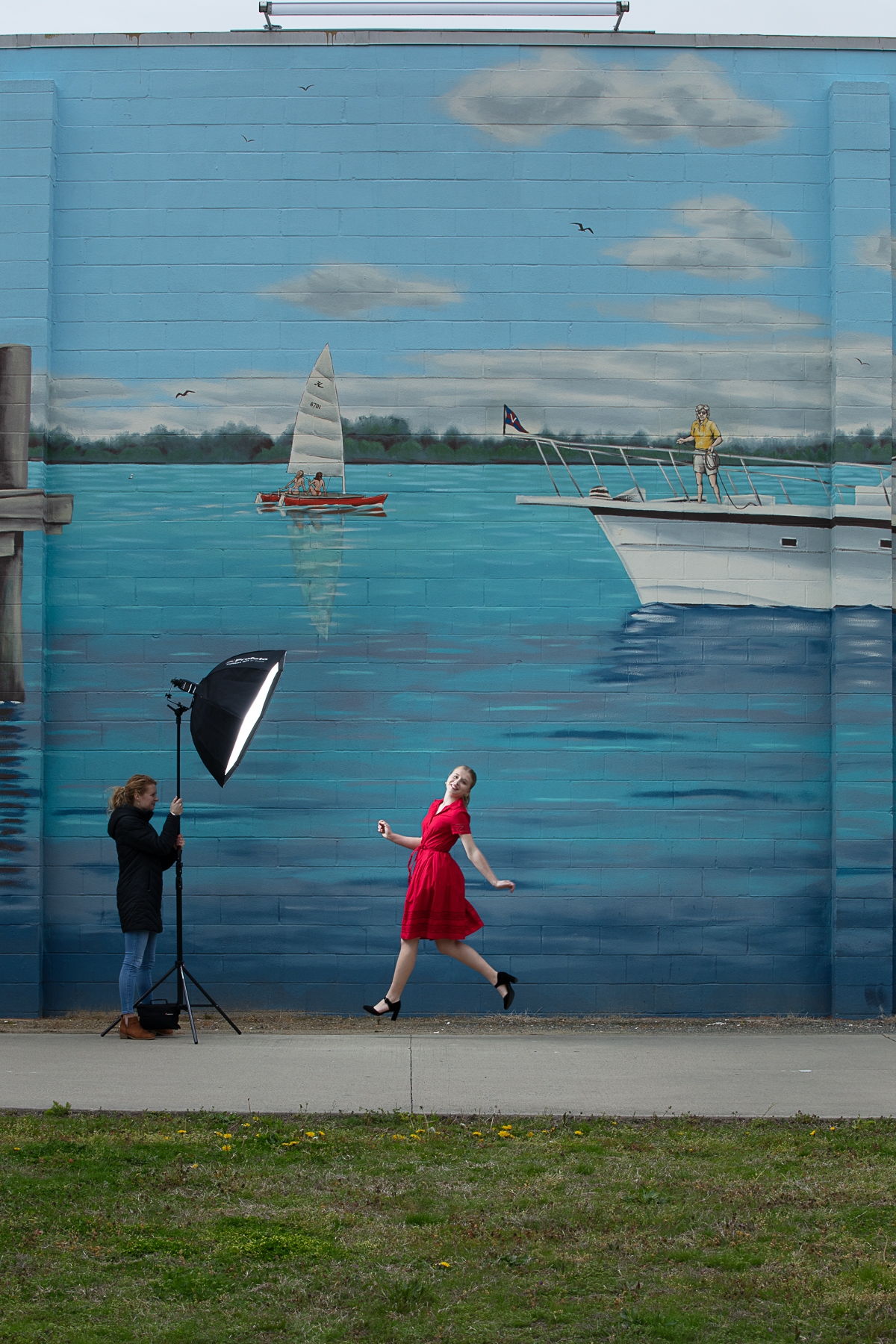A high school senior in front of her favorite mural. This panorama is hand-stitched together with 7 individual shots to have the whole mural in view. The red dress was chosen to contrast the blue mural. A softbox with speedlites were used to add light on the subject. So both the red dress and the added light draw attention to the subject.