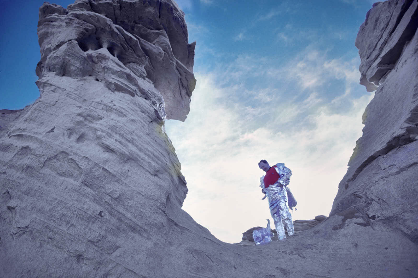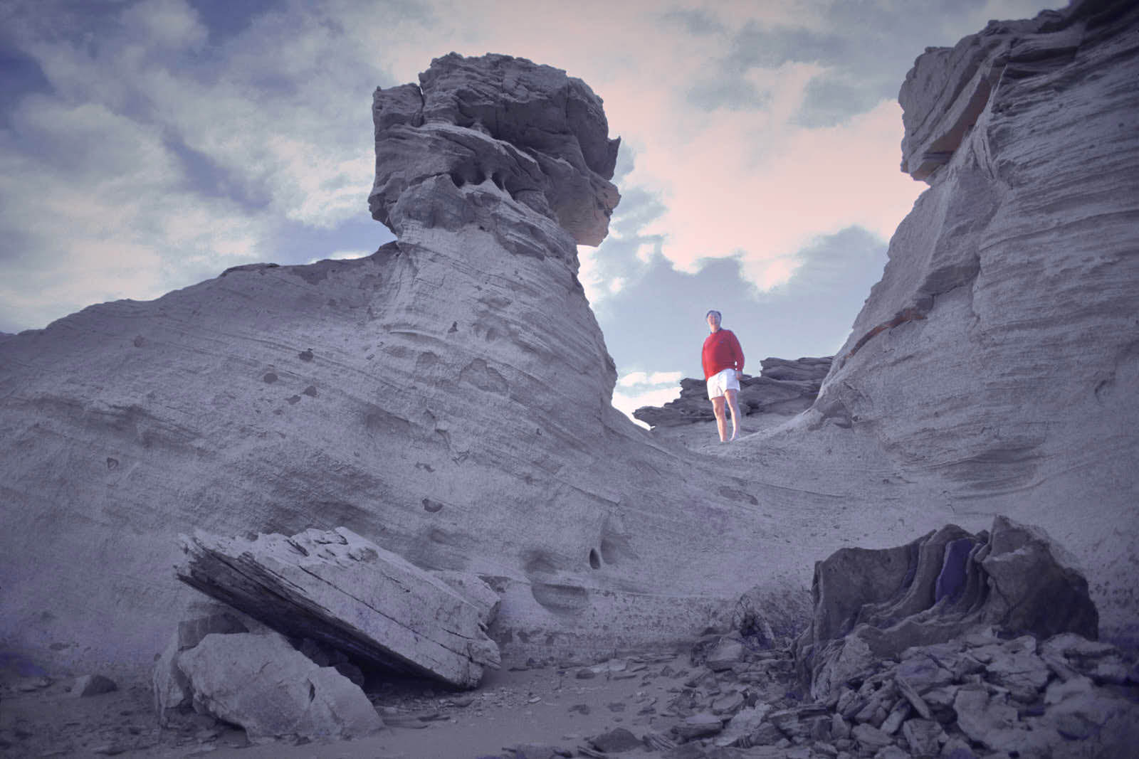 My father-in-law wanted an early morning portrait, but was feeling a bit chilled. I suggested a wrap-up in aluminium foil. He was game. We were too early to get direct sunlight on him from behind, so a 3×4 ft softbox was set up to mimic the sun. I positioned him (prior to wrapping) such that the softbox could be hidden behind the rocks (camera left).