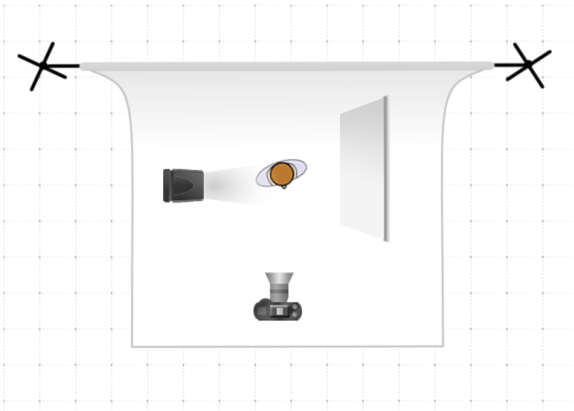 Black vinyl backdrop. Alien Bee to the left with a strip box and baffles to keep light off the background. Huge silver modifier to the right to provide fill.